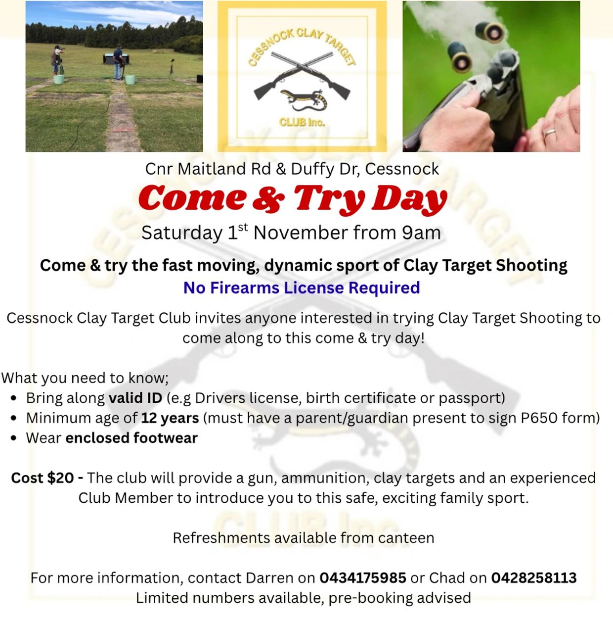 We can offer people the opportunity to try out clay shooting in private group bookings (minimum of 5). WE ARE CURRENTLY BOOKED OUT TILL MID JANUARY You do not need to hold a firearm licence and will be under the supervision of a fully licenced club member. Please provide the club with plenty of notice as we require club volunteer's to run the event. This can be a very unique experience while visiting the Hunter Valley, first you can shoot sporting clays and clay trap shooting then experience the food and wineries in the Cessnock region.